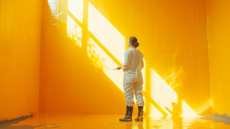 Painter wearing white clothes working on a room with bright yellow painted walls