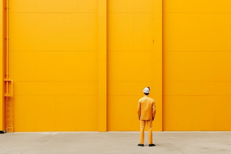 A construction worker in a yellow hard hat stands with a backpack gazing at a bright yellow wall under a clear blue sky.
