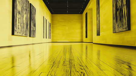 Contemporary Art Gallery with Vibrant Yellow Lighting and Reflections.