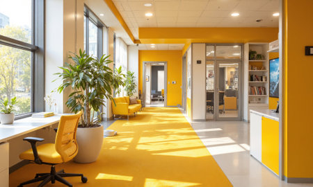 Lobby Interior Design Modern Building: Spacious contemporary reception area showcasing sunlight, furniture, and large windows.