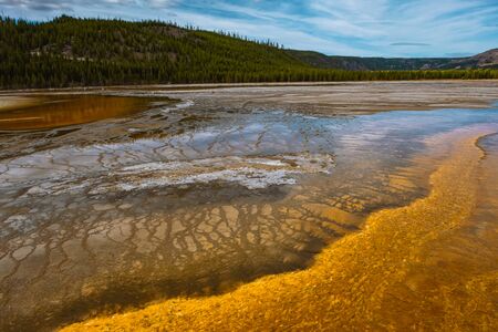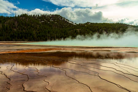 Distant side view of Grand Prismatic Spring on the Fairy Falls trail in Yellowstone National Park. High quality photo