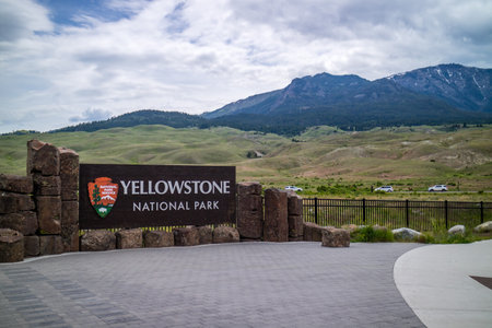Yellowstone NP, WY, USA - June 23, 2019: A welcoming signboard at the entry point of the preserve park