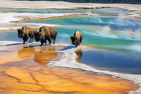 Bison walking near Grand Prismatic Spring, Yellowstone National Park
