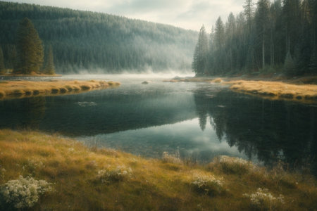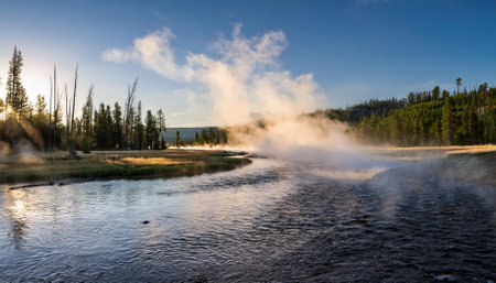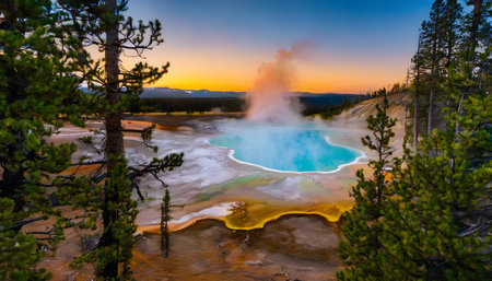 Tranquil scene of a colorful sunset reflecting on a lake in yellowstone national park, with steam rising from the water