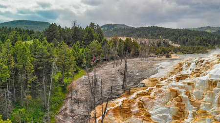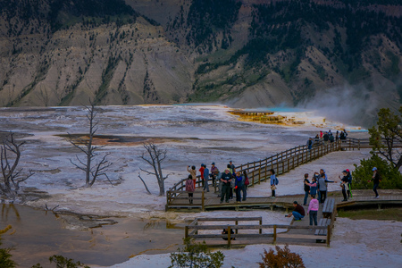 YELLOWSTONE, MONTANA, USA MAY 24, 2018: Above view of unidentified tourists walking in the horiznot over a boardwalk in Mammoth Hot Springs,Yellowstone National Park
