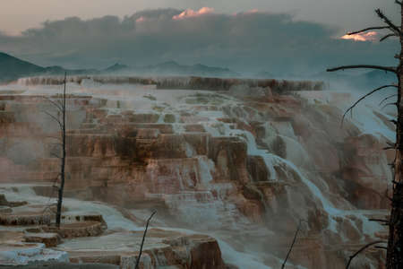 Water Streams Over Hot Springs Terraces in Mammoth Hot Springs in Yellowstone National Park
