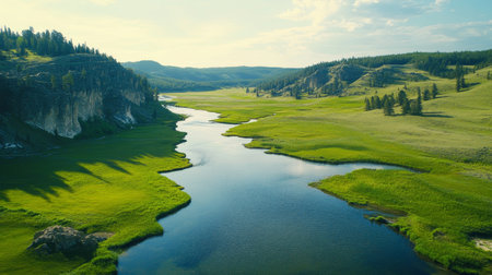 Stunning aerial view of yellowstone river amidst lush grasslands and rocky cliffs under blue sky