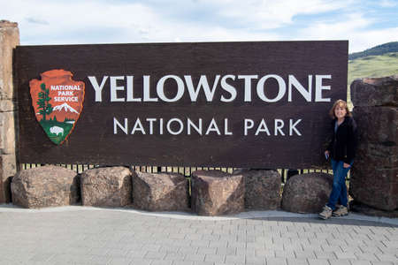 Female tourist standing next to the Yellowstone National Park sign on the north entrance, horizontal