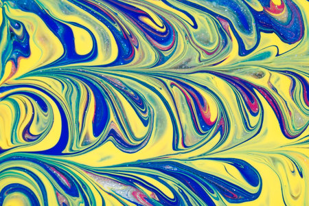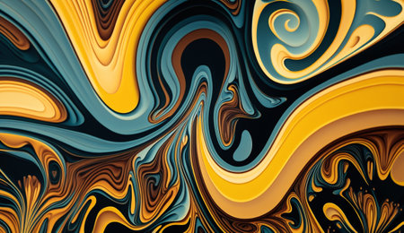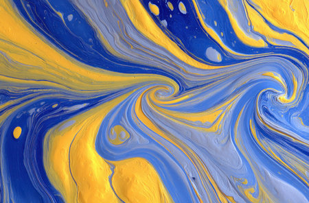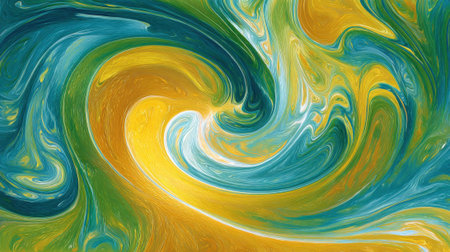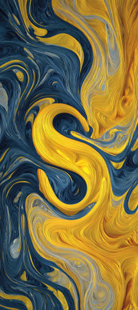 An abstract artwork features a swirling pattern of yellow and blue hues. The composition displays a liquid-like effect with blended colors, creating a sense of movement and depth. The dynamic design could be suitable for a variety of commercial and editorial purposes, such as website backgrounds or print designs.