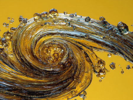 Swirling liquid motion suspended in air with glistening bubbles, intricate wave pattern, dynamic energy, shimmering fluid texture, transparent and golden hues create a captivating abstract