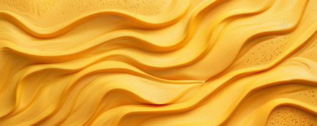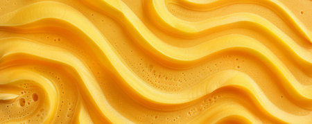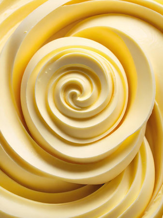 Close-up view of swirling yellow cream, exhibiting smooth texture and glossy highlights. The image is well-lit, creating a vibrant and appetizing mood, suitable for food packaging or culinary blogs.