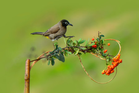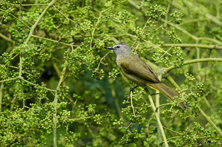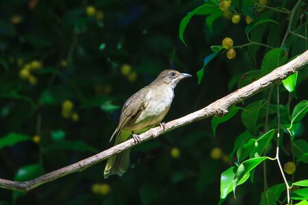 Flavescent Bulbul perching on branch of fruiting tree (Pycnonotus flavescens)