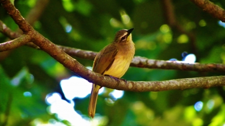 A yellow - vented bulbul is perching on a tree branch and gazing upward.