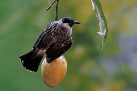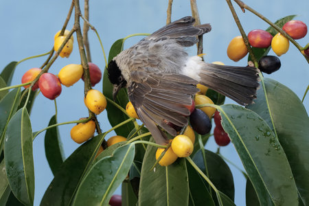 Close up of a Bulbul bird (Pycnonotus goiavier) feeding on fruits