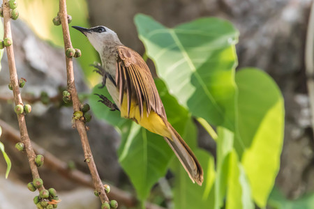 Striped throated bulbul bird enjoy eating fruit of banyan tree (food of birds and various animals in tropical rainforest) in nature in Thailand