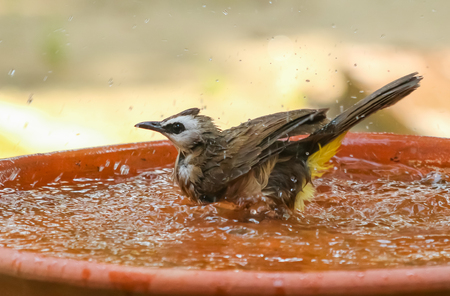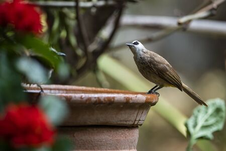 A yellow - vented bulbul is perching on a rim of water basin.