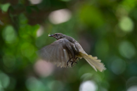 A yellow - vented bulbul is flying into the air with its food.