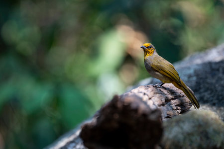 A stripe - throated bulbul is standing on a decayed wood log.