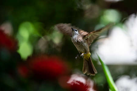 A red - whiskered bulbul is flying into the air to get food.