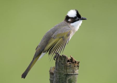 An adult sooty - headed bulbul is perching on a wood stump.