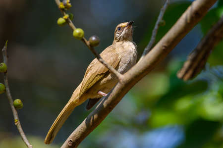 A streak - eared bulbul is perching on a tree branch and making calls.
