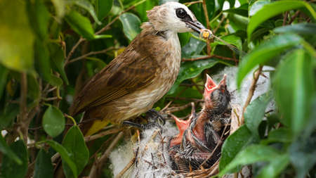 Mother bird feeding bapy birds in a nest of yellow-vented bulbul (Pycnonotus goiavier), or eastern yellow-vented bulbul, is a member of the bulbul family of passerine birds in nature at Thailand
