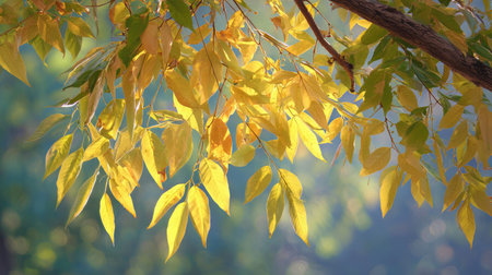 Sunlight filtering through yellow autumn leaves hanging from tree branches in a forest. Ai generated image