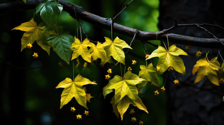 A stunning scene of a twisting branch adorned with vibrant yellow flowers in a lush green forest, capturing the beauty and tranquility of nature.