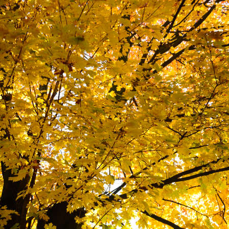 The tree branches full of yellow leaves in Autumn with the blue sky in the background