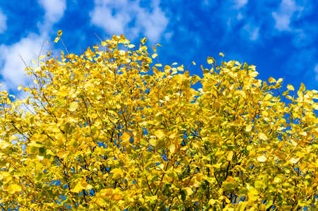 Beautiful colored birch leaves in front of a clear blue sky. Excellent contrast.