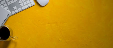 Top view of creative workspace with computer device, schedule book, coffee cup and copy space on yellow concrete background