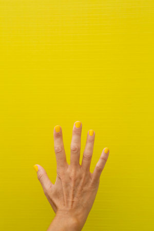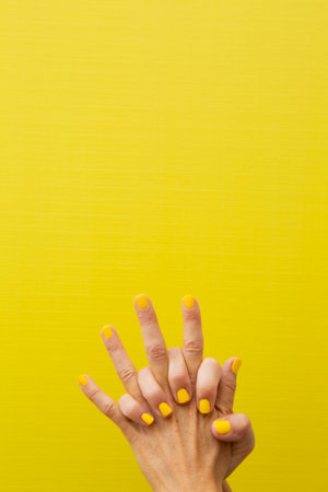 Vertical photograph of a woman's hand with her nails painted yellow on a yellow background showing all five fingers.