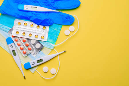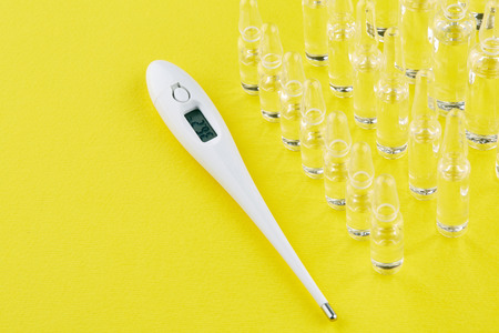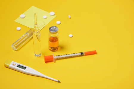 pills, electronic thermometer, ampoules with medicine and syringe on yellow background copy space top view, vaccination concept