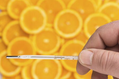 Cropped hand holds a mercury thermometer over a pattern of fresh slices of orange as a concept of nutrition supplement against flu
