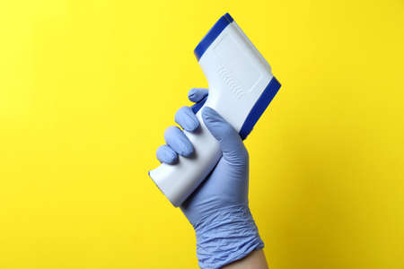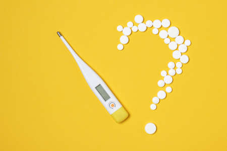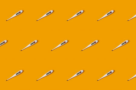 Digital electronic thermometer on the yellow colored background to cover on a yellow background. Epidemic concept. Regular pattern, flat lay.