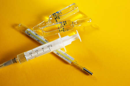 Electronic thermometer and syringe ready for use lie on the yellow color.