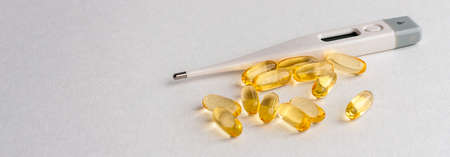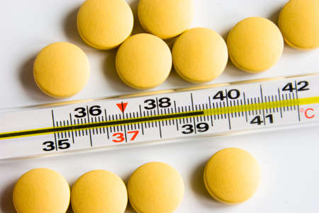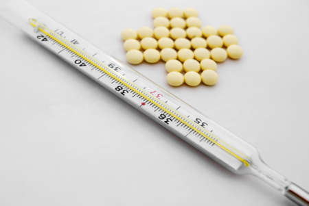 Mercury thermometer. The thermometer shows a high temperature. Nearby are yellow pills. Located in the center. The white background. Medicine. Disease. Coronavirus. Copy space