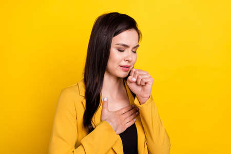 Photo of sick young lady cough wear yellow blazer isolated on vivid color background