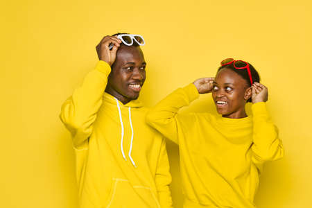 Front view on body part of young female in sweatshirt and pants on gray background. Close up of unrecognizable woman put hands in pocket of yellow hoodie