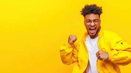 A young man with curly hair and glasses is expressing sheer joy while wearing a bright yellow jacket. He is celebrating with raised fists, bringing energy to a cheerful indoor environment.