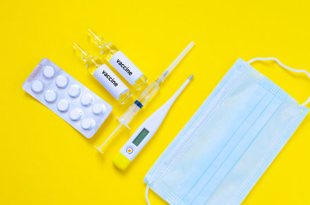 ampoule, mask, syringe, thermometer and vaccine ampoules on a yellow background