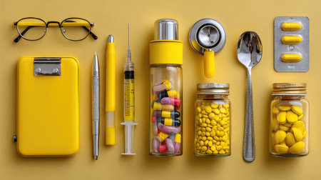 A vibrant flat lay image showcasing an array of yellow items, including medical supplies and stationery, arranged neatly on a bright surface, creating a cheerful and artistic composition.