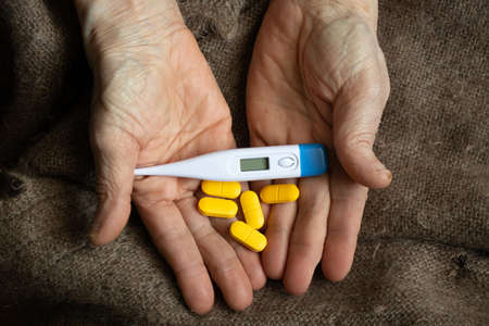wishing woman holds an electronic thermometer and pills in her hands on the bed, fever and fever during a pandemic, weightless temperatuka, sick pensioner