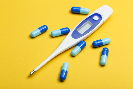 Glass mercury thermometer and white medical pills, tablets from glass bottle on yellow background. Pharmacy theme, treatment and prevention of virus. Concept of health in season of colds.