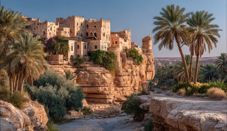 Historic village built on a rocky cliff, surrounded by palm trees and greenery, creating a tranquil atmosphere that reflects cultural richness and natural beauty