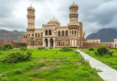 The huge mosque of the European style in Sana'a, Yemen, has two minarets and domes on top. There is green grass around it and a cloudy sky. The exterior walls are made from beige-colored stone, which gives an elegant look to its appearance. There is also some vegetation that adds color to the surroundings. In front of you can see a large open space with concrete walkways leading up to the entrance doors of the Al-Aziz Grand Mosque in Sana'a city. --ar 22:15 --v 6.1 Job ID: ac94f836-cc4e-4020-b451-a22ad5f7dc70