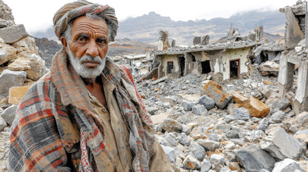 Old senior arab man in ruined city Hajjah, Yemen.