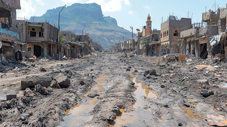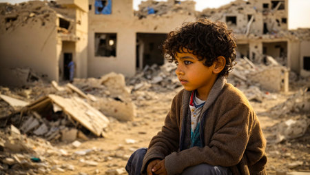 Portrait of a sad boy against the background of destroyed houses in Palestine