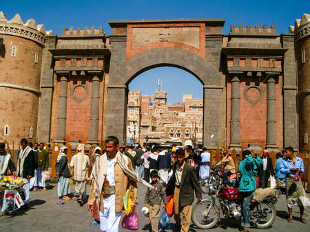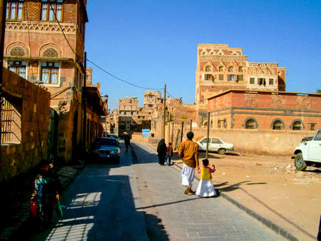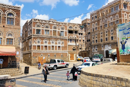 SANAA, YEMEN - MAR 6, 2010: Typical street scene in old city of Sanaa. Inhabited for more than 2.500 years at an altitude of 2.200 m, the Old City of Sanaa is a UNESCO World Heritage City now destroyed by the civil war