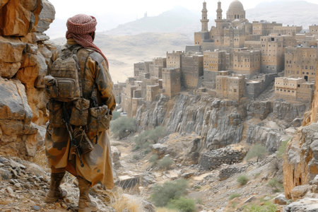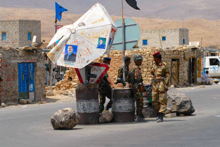 Hadramaut Valley, Yemen, September 10, 2006 - Yemeni military on duty at the security checkpoint, Hadramaut valley, Yemen. Tourism in Yemen is dangerous now because of kidnappings.